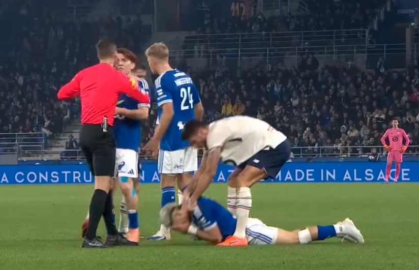 En el minuto 36, el delantero guaraní terminó en el piso luego de recibir un leve empujón de un rival. Apurado por la desventaja en el marcador, el atacante del Lille perdió la paciencia y utilizó una técnica poco ortodoxa para levantar a Enciso; lo agarró del hombre, casi del cuello prácticamente y lo subió con fuerza.